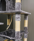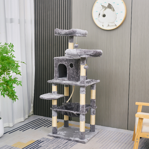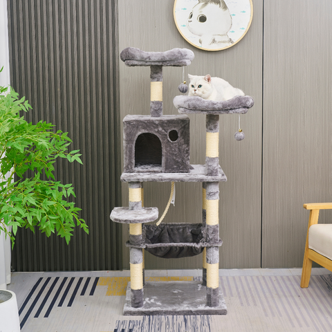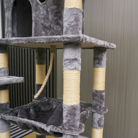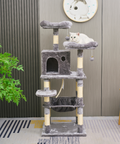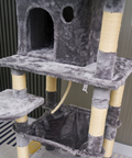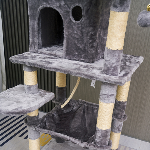 Crafted in a soft, elegant grey finish with durable sisal-wrapped posts, the Halo Cat Tree combines function with modern style. It features two plush top perches for lounging, a cosy enclosed condo for restful naps, and a hammock for next-level relaxation. Hanging pom-pom toys encourage active play, while the scratching posts help satisfy your cat’s natural instincts — and protect your furniture at the same time!